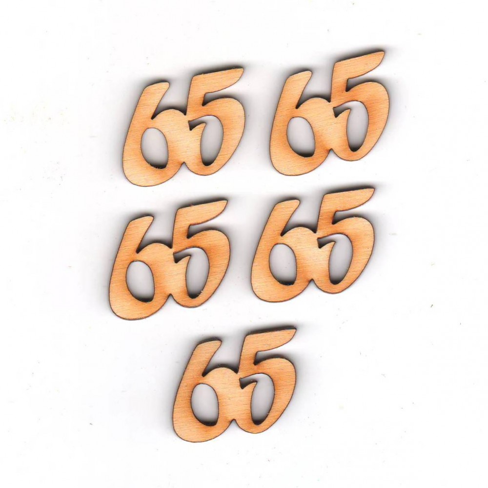 Geburtstagszahl "65" ist aus 3 mm starkem Birkenholz mit einer Höhe von 21 mm und einer Breite von 26 mm.