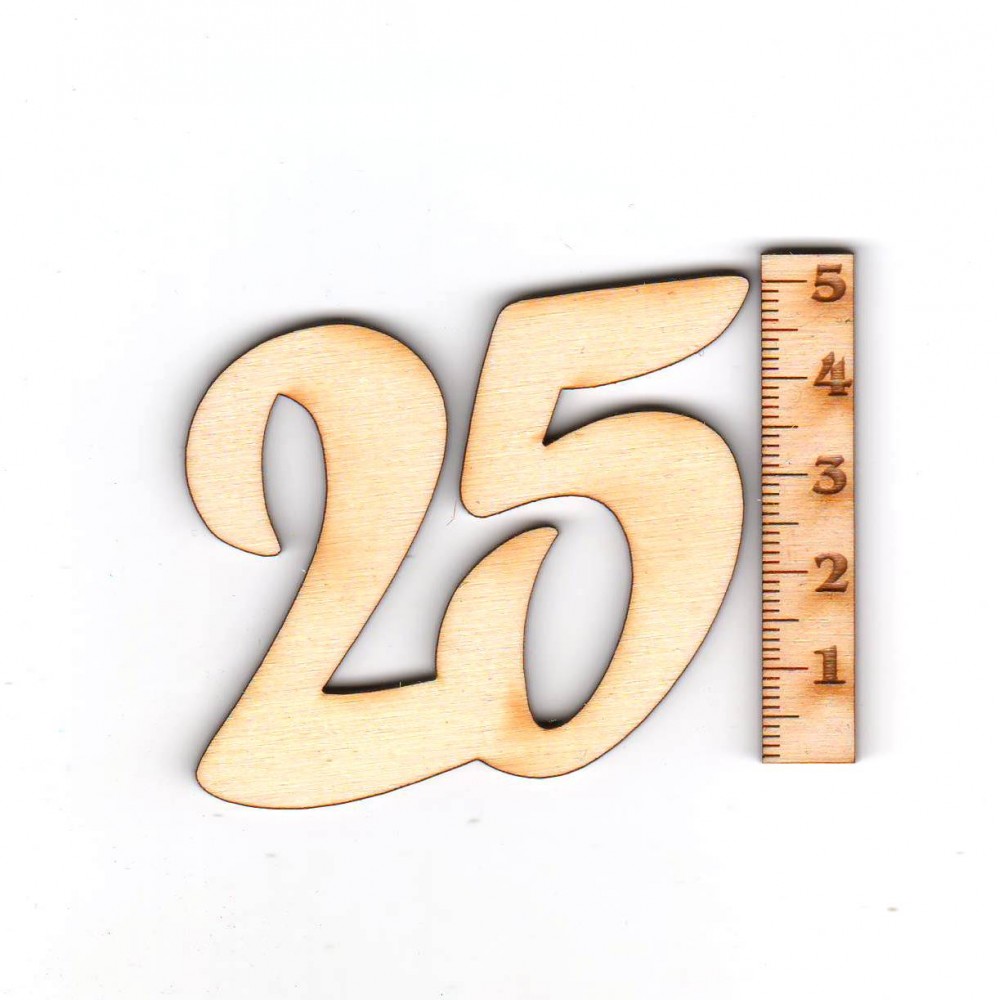 Geburtstagszahl "25" aus 3mm Birkenholz hat eine Höhe von 33 mm und eine Breite von 40 mm.Die Zahl 2..
