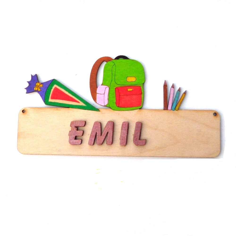Türschild mit einer Schultüte, einem Schulranzen und Stifte, 18 cm lang, 9,2 cm hoch, unbemalt, inklusive 2