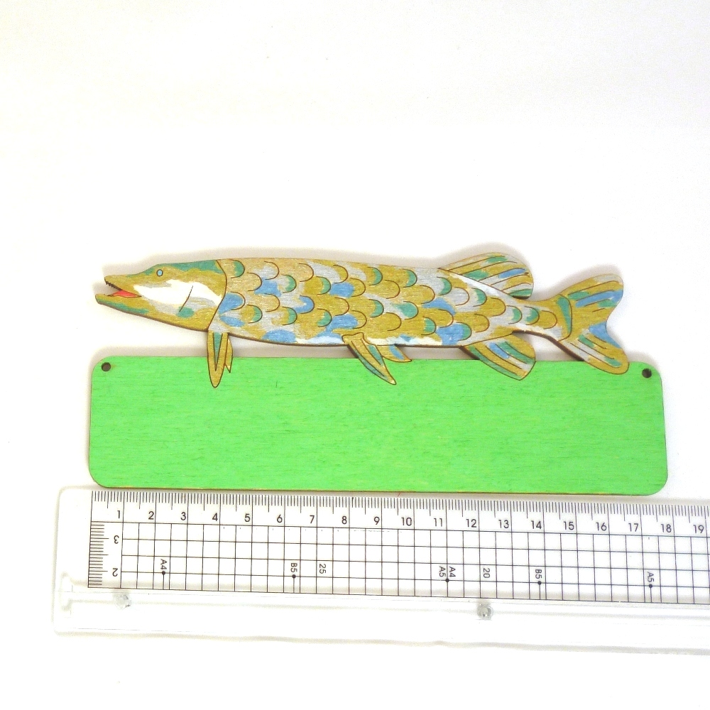 Türschild mit einem Hecht, 18 cm lang, 9,1 cm hoch, unbemalt, inklusive 2