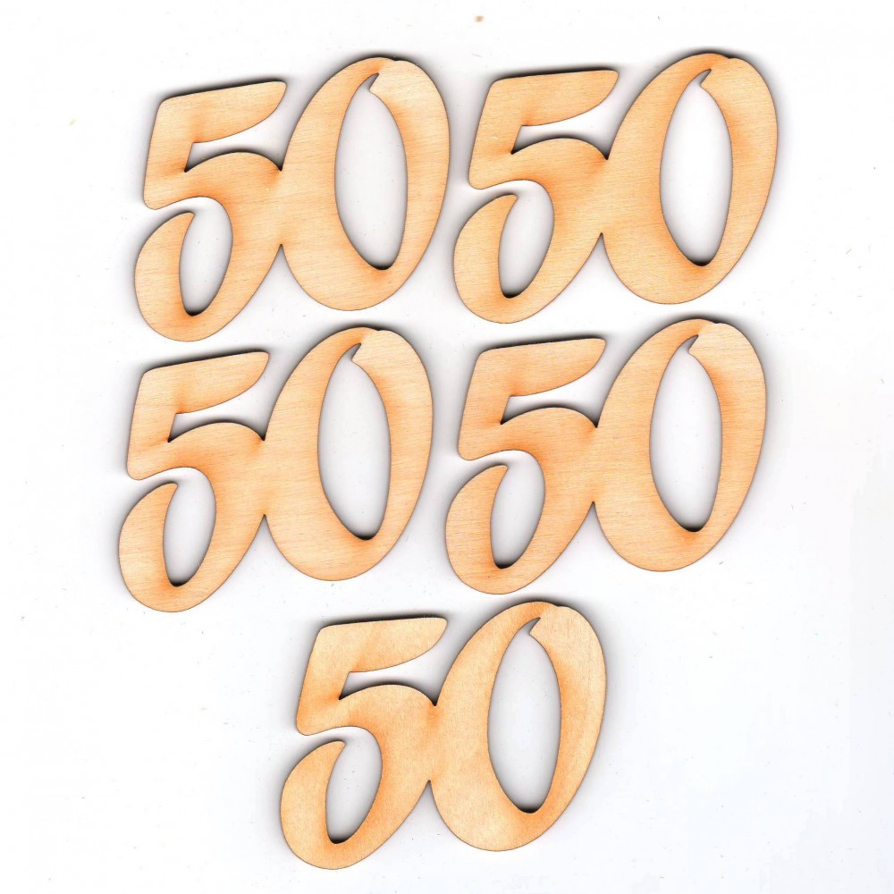 Geburtstagszahl "50" ist aus 3 mm starkem Birkenholz mit einer Höhe von 50 mm und einer Breite von 62 mm inklusive Füße zum hinstellen.