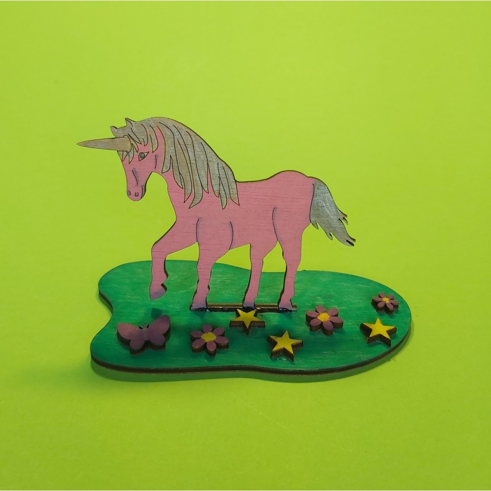 Im Set enthalten sind ein Einhorn, drei Sterne, drei Blumen und ein Apfel, sowie eine Unterplatte zum Hinstellen.