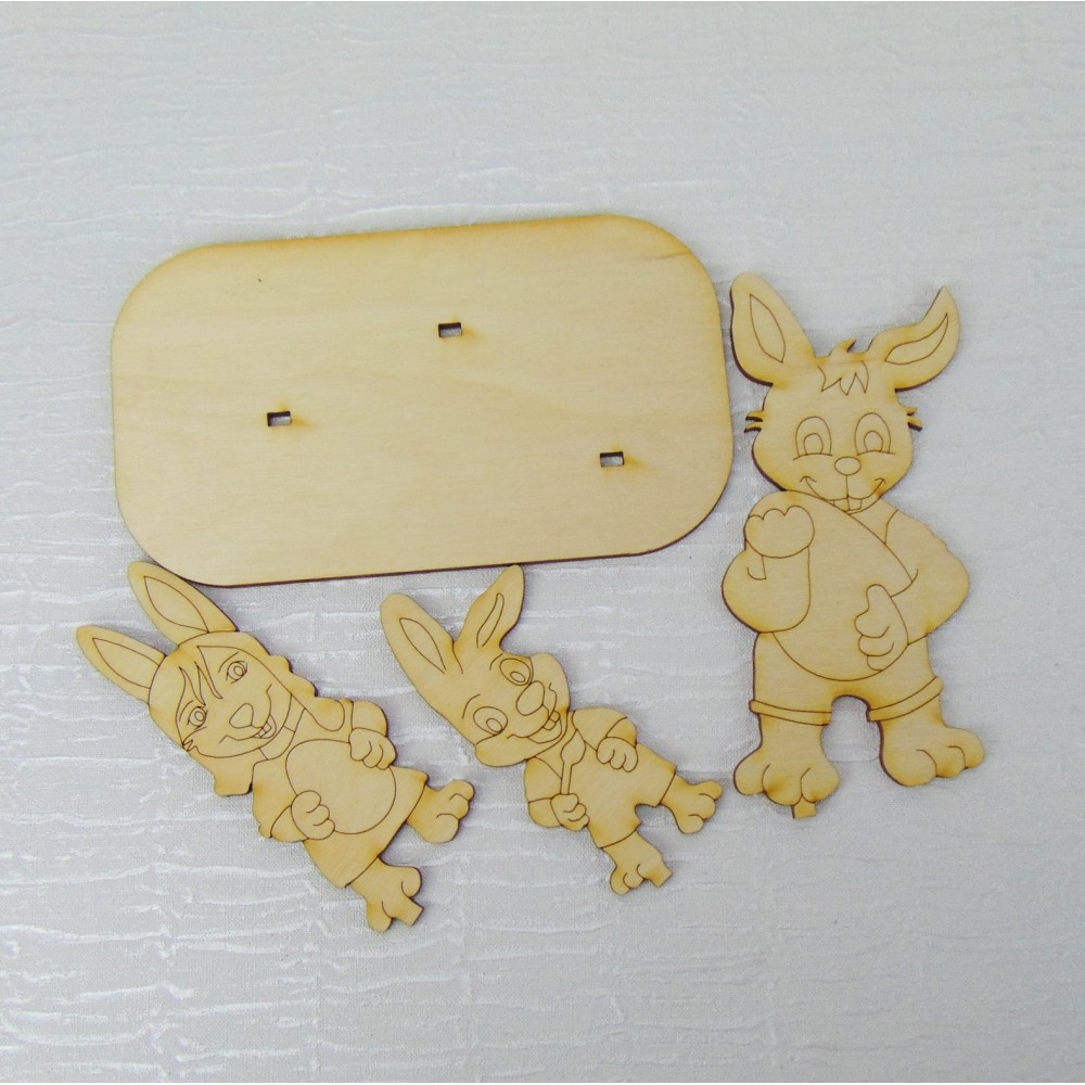 Das 4 teilige Bastelset besteht aus einer 3 köpfigen Hasenfamilie, Mama, Papa, Kind - die auf eine Bodenplatte geklebt werden können, damit das Ganze sicher steht.