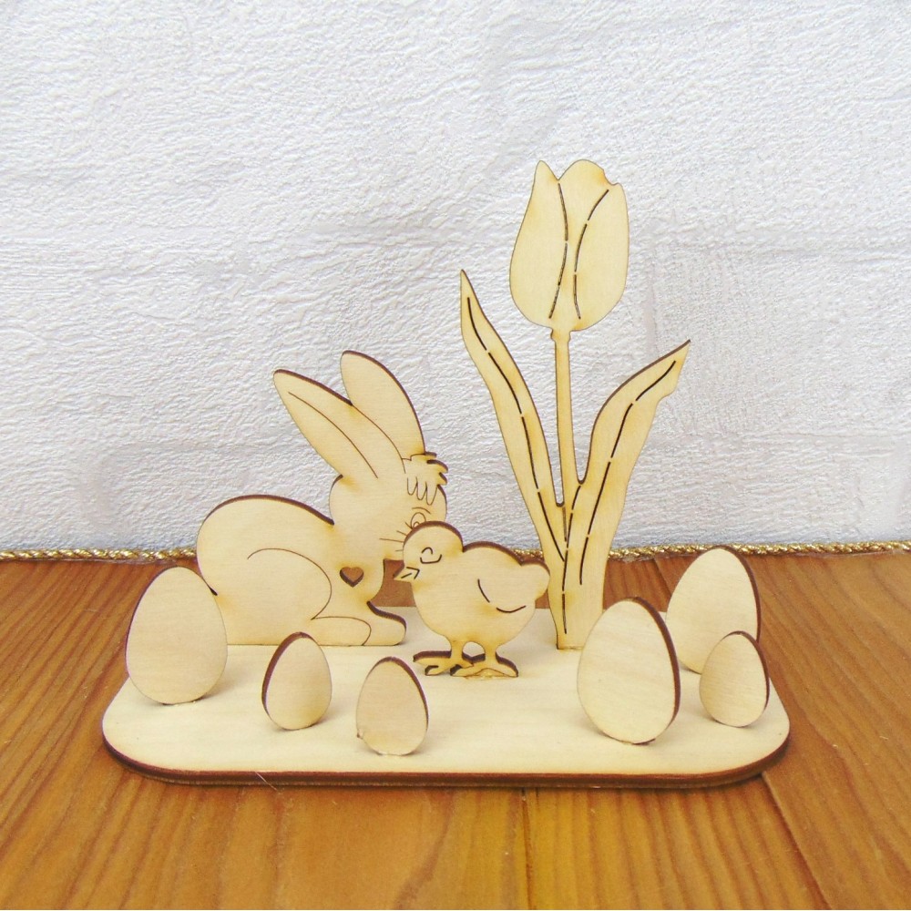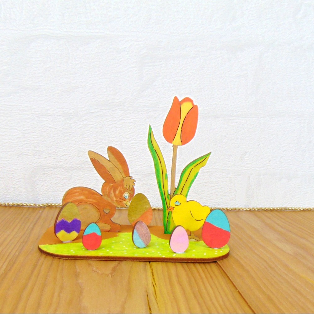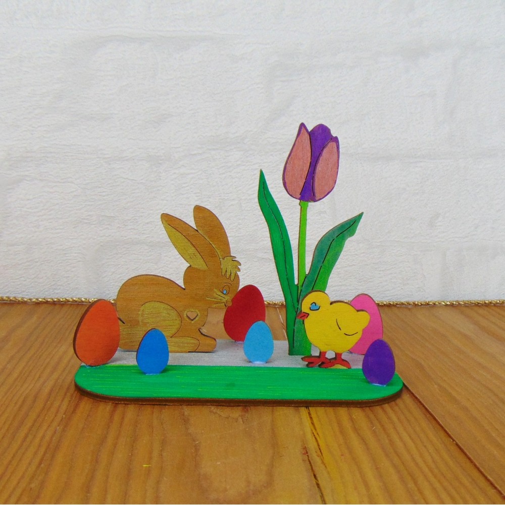 Das 10 teilige Bastelset besteht aus fröhlichem Osterhasen, Küken, Tulpe und 6 Eiern - die auf eine Bodenplatte geklebt werden können, damit das Ganze sicher steht.